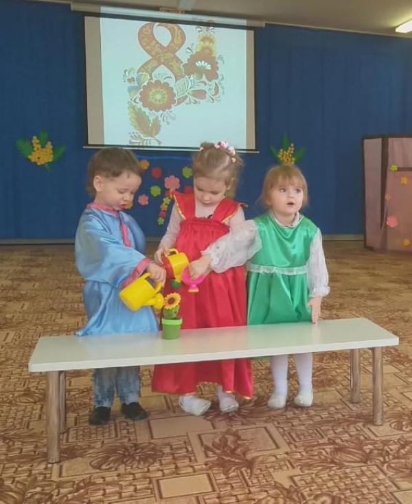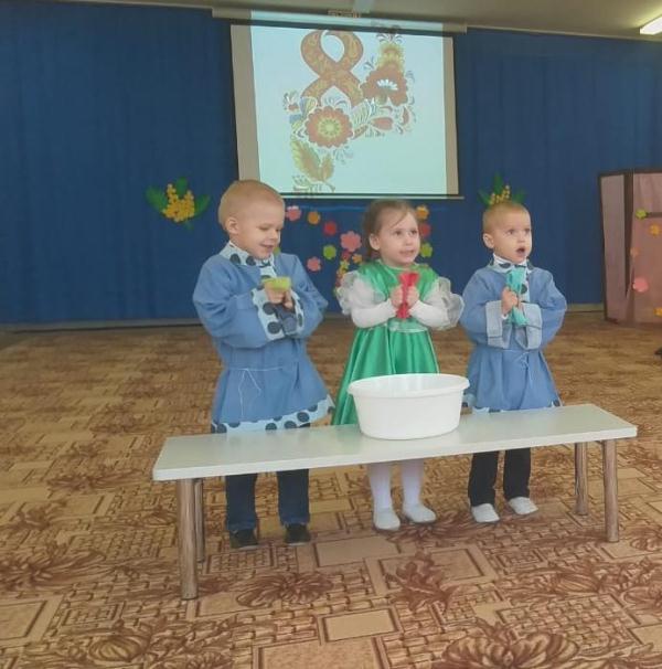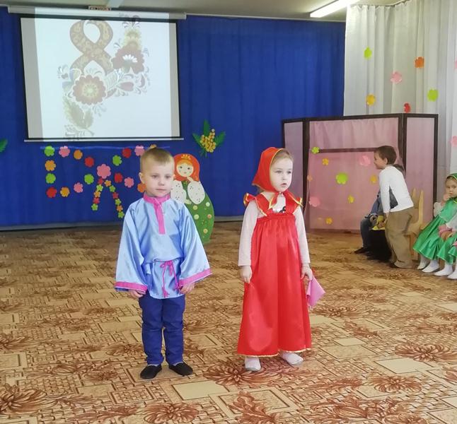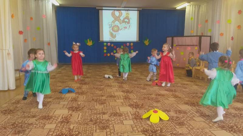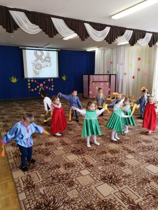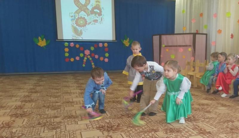 Во второй младшей группе №4 прошел праздник, посвященный дню 8 марта. Детки долго готовились к нему. Разучивали новые песни и танцы, выучили стихи для любимых мам и бабушек. В гости к ребятам пришла Матрешка, которая испекла на праздник для ребята колобка, поставила его на окошко студится, а то он был горячий. А пока он остывал, она ребятам предложила покататься на красивой, яркой, праздничной карусели, дети с удовольствием играли с ней в хороводные игры, станцевали танец «Гопачок» и спели песню «Ладушки-ладошки». А еще как настоящие музыканты сыграли на музыкальных инструментах, девочки танцевали танец «Матрешки». В конце мероприятия, колобок, который уже остыл попросил ребят не есть его, а вместо этого он подарил малышам сладкие угощения. Праздник доставил всем много радости и приятных впечатлений.