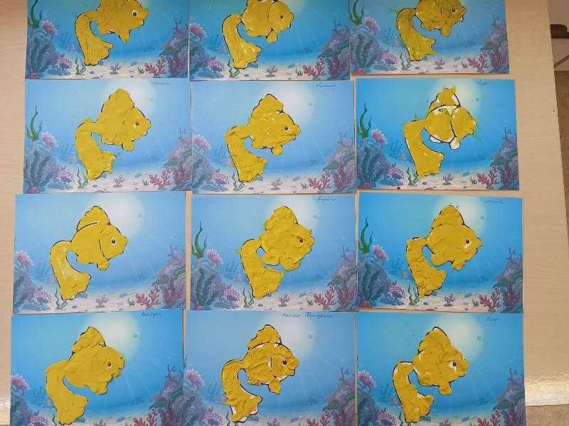 Ребята вспомнили любимые сказки А. С. Пушкина: «Сказка о золотом петушке», «Сказка о попе и о работнике его Балде», «Сказка о рыбаке и рыбке». Дети слушали стихи, отрывки из сказок, с большим интересом рассматривали иллюстрации книг, раскрашивали иллюстрации персонажей сказок. Детям так понравилась золотая рыбка, что ее решили выполнить в технике пластилинографии.