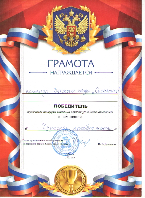 Администрация детского сада "Солнышко" выражает огромную благодарность нашим сотрудникам, родителям за участие в конкурсе, создание очень красивой снежной скульптуры. Мы все получили массу положительных эмоций.