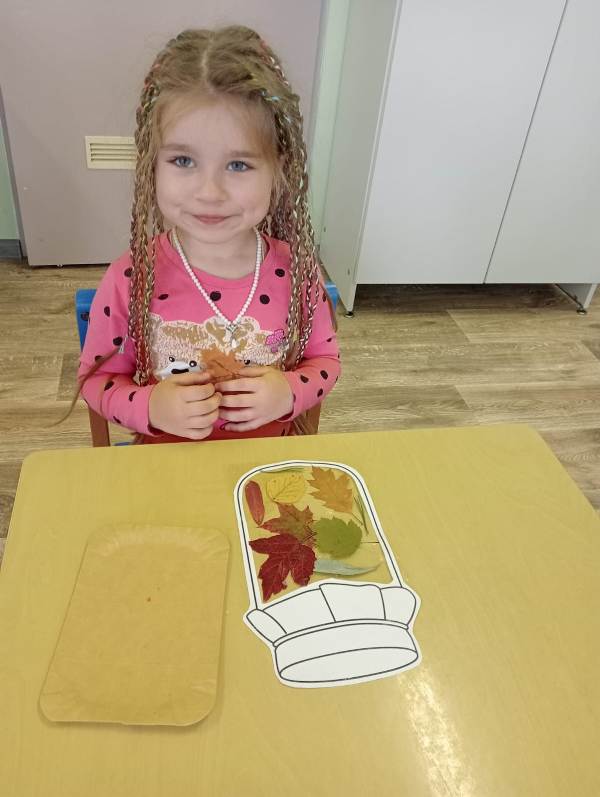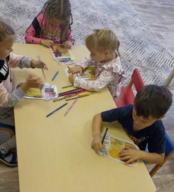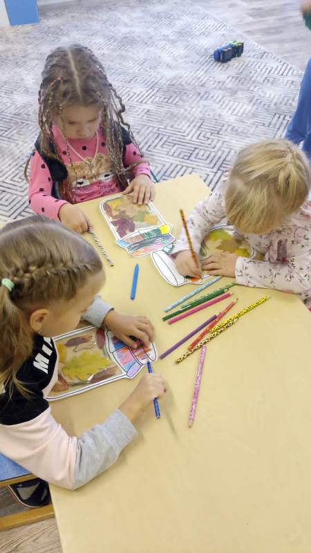 С воспитанниками была проведена аппликация: дети на скотч приклеивали ранее заготовленные листья различных деревьев, а после, разукрашивали крышечки банок цветными карандашами.