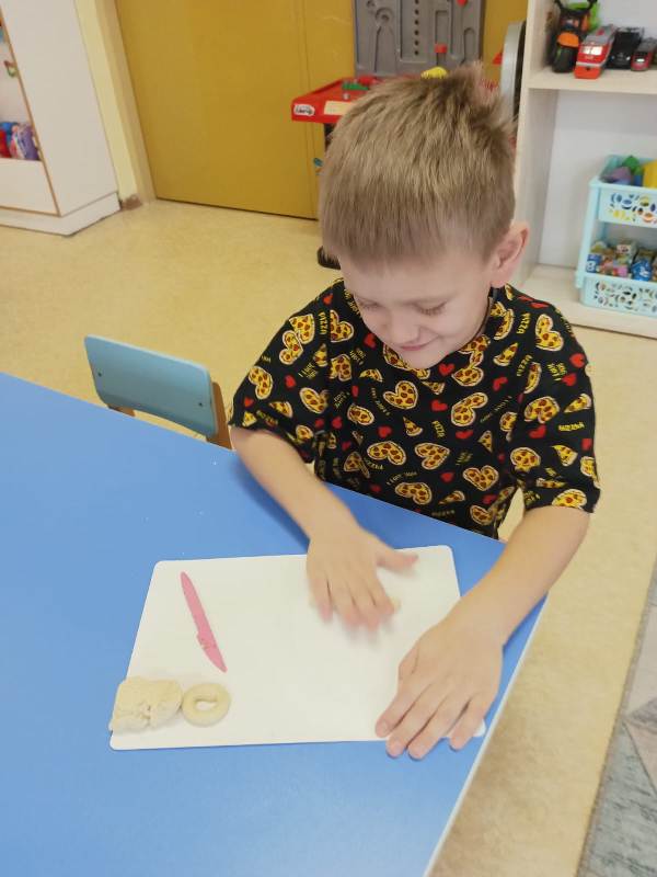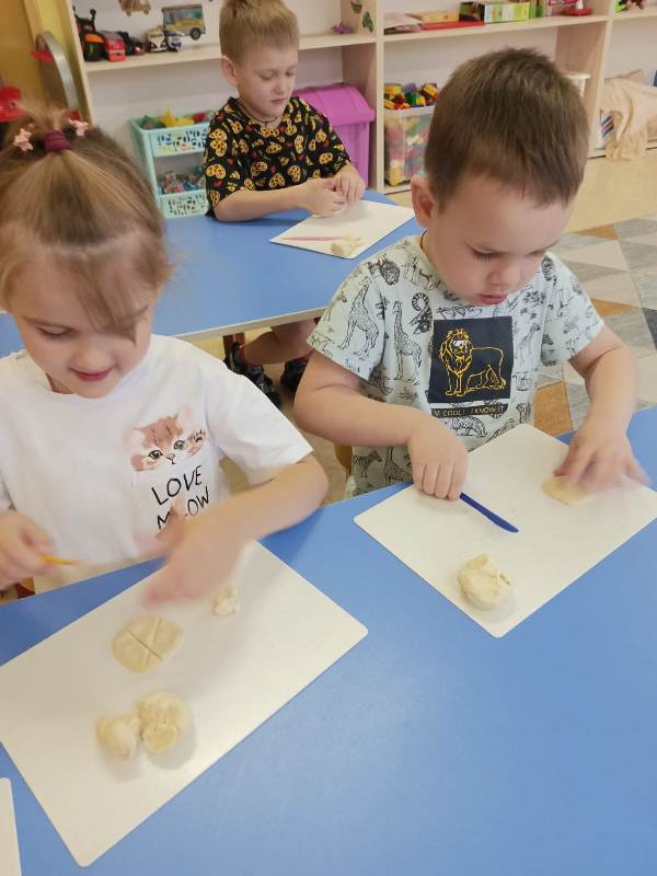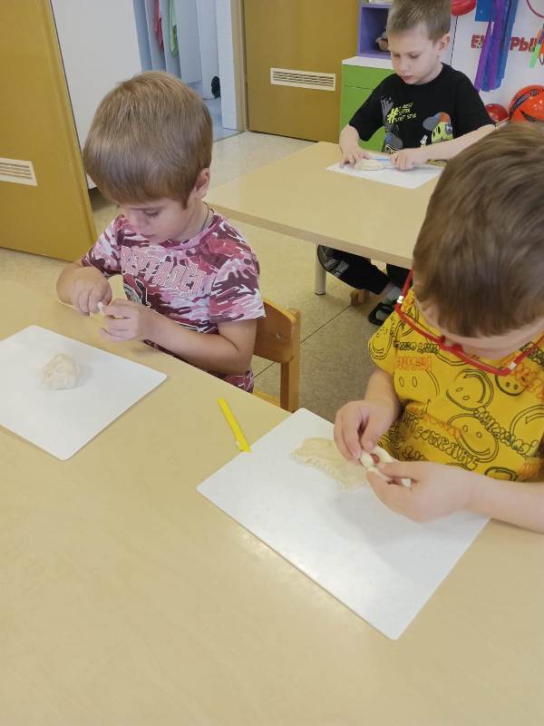 Ребята узнали, что нужно для того, чтобы замесить тесто. Ребятам очень понравилось работать с тестом — они его месили, катали и крутили.