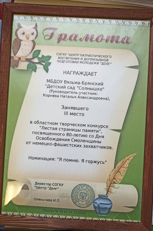 28 ноября методист Корнева Н.А. побывала в г. Смоленске на мероприятии "Подведение итогов областного творческого конкурса "Листая страницы памяти", посвященного 80-летию со Дня освобождения Смоленщины от немецко-фашистских захватчиков, который проходил среди дошкольных и образовательных Учреждений для детей с ОВЗ Смоленской области", которое прошло на базе научной библиотеке имени А.Т. Твардовского.
